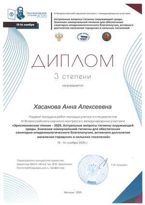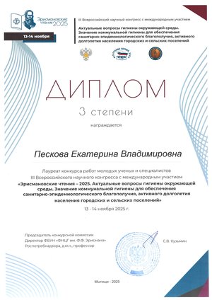 13-14 ноября 2025 г. прошел III Всероссийский научный конгресс с международным участием «Эрисмановские чтения – 2025. Актуальные вопросы гигиены окружающей среды. Значение коммунальной гигиены для обеспечения санитарно-эпидемиологического благополучия, активного долголетия населения городских и сельских поселений». От ФБУН «ФНЦ медико-профилактических технологий управления рисками здоровью населения» в Конгрессе были представлены следующие доклады: