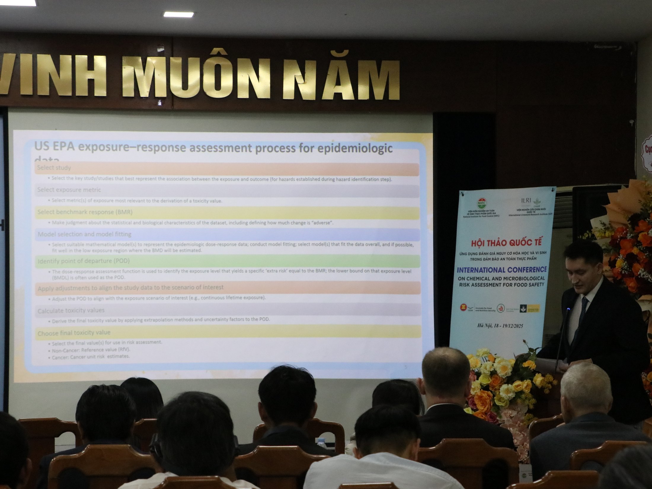 Специалисты ФБУН «Федеральный научный центр медико-профилактических технологий управления рисками здоровью населения» принял участие в Международной конференции по оценке химического и микробиологического риска для обеспечения безопасности пищевых продуктов International Conference on Chemical and Microbiological Risk Assessment for Food Safety, проходившей с 18 по 19 декабря 2025 года в г. Ханой, Социалистическая Республика Вьетнам, организованной Министерством здравоохранения Социалистической Республики Вьетнам и Вьетнамским центром по оценке риска при потреблении пищевых продуктов на базе Национального института по контролю качества пищевых продуктов. Конференция объединила ученых из Вьетнама, Таиланда, Камбоджи, Южной Кореи, России, Ирландии, Германии для обмена опытом в оценке и управлении риском здоровью и обеспечении безопасности пищевых продуктов.
